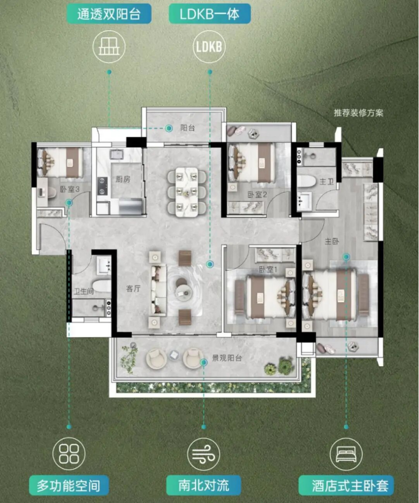 配置长7米的南向阳台,270°主卧观景舱,约33米采光面,视野和景观面实现最大化。