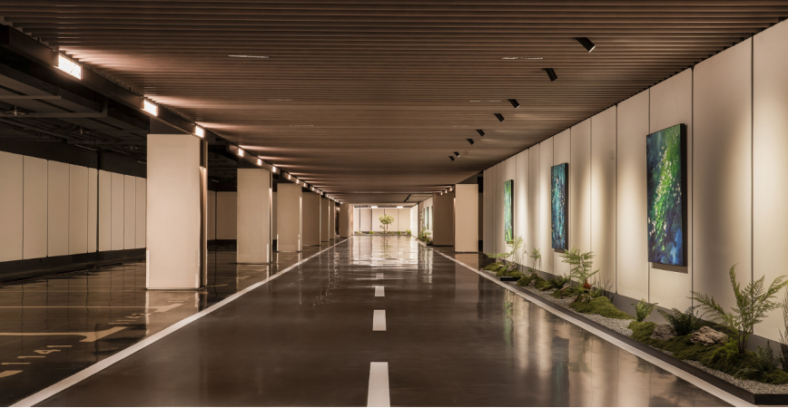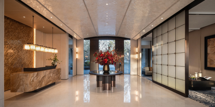 融创壹号院全新实景区域的一大亮点,在于对“归家动线”的定制设计和建造品质的完整呈现。其中,社区大堂的呈现令人印象深刻,贝母艺术穹顶呼应细腻的暖色石材地面,营造出回家的暖意与仪式感。从社区入口到单元大堂、从地下车库到电梯厅,各处空间注重了材质搭配与光影氛围,归家过程松弛且有序,有如高奢酒店式的礼制体验,使客户能够直观感知未来的生活图景。