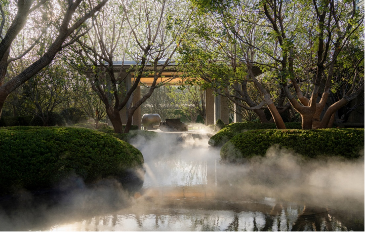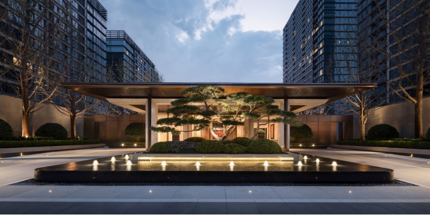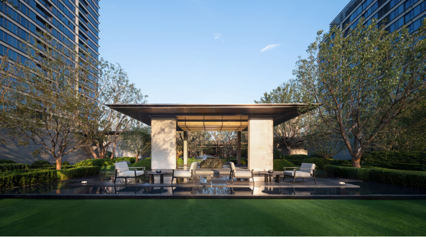 同样初次呈现的,还有在近百米的南北楼间内打造的景观园林核心区。据介绍,融创壹号院的园林以“新都市自然主义”为理念,国际、都会与自然的格调贯穿始终,强化空间对称的序列感与几何美学的艺术性。自住区大堂进入,即见大片镜面水景、廊亭和草坪构成的景观核心轴。两侧错落的廊道之间,由多层次植被组合与微地形营造,可赏、可游、可栖,也带来了尊贵、隐逸的独特感官体验。