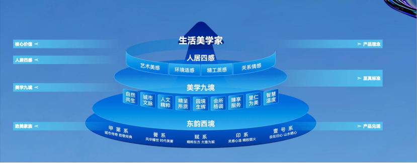 具体而言,不只要“造房子”,更要“造生活”。遵循“产品领先”战略,以美学重构生活价值,以“东韵西境”为设计理念,以“四感九境”筑基,从物理空间到生活美学,从功能属性到心安共鸣,回归生活本质,践行高品质人居标准,让产品更加贴合居者所需。