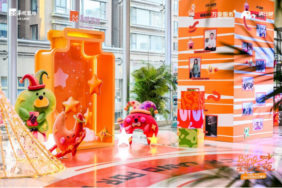 晚会的入场区欢乐隆重,吉祥物“星星人”与大小业主亲密互动,到场嘉宾在入场前通过在各个互动展区打卡,在扭蛋机抽奖,晚会开场前就锁定第一个礼品惊喜。