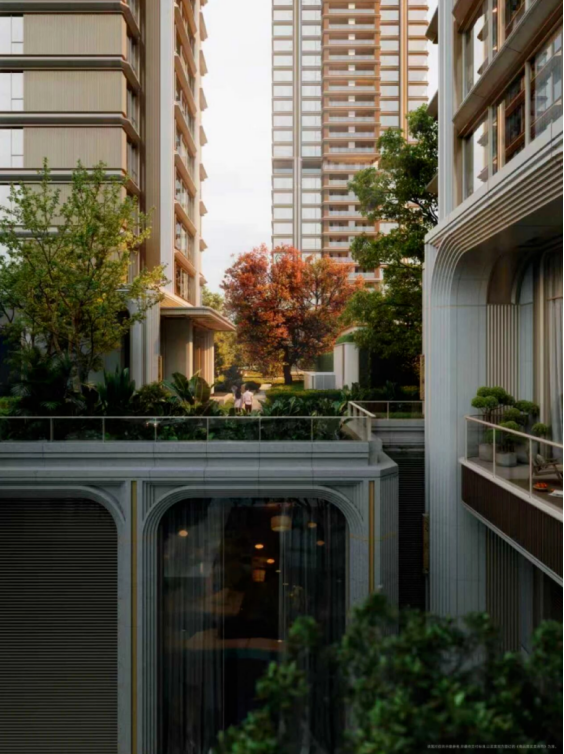 约14米的生态基座之上,一个垂直生长的庄园式双层园林体系应运而生,提升生活的私密性,又通过“垂直绿化空中花园”与“架空层泛会所”的融合,创造“好房子”的生活友好性,让回家成为一场穿越花园的沉浸式体验。