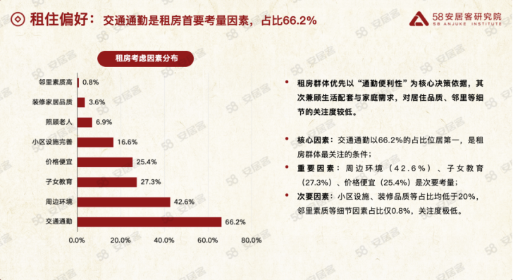 对于租房人群而言,居住的逻辑对比购房人群有明显差异。58同城、安居客调研数据显示,66.2% 的租房人群将交通通勤列为首要考虑因素,显著高于周边环境、子女教育或小区硬件设施等条件。