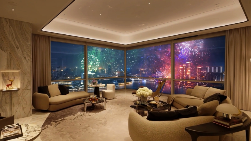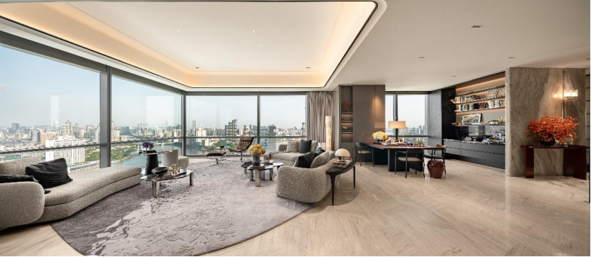 对稀缺资源的“极致占有”,是瑞玺的核心竞争力。“把江河请进生活”,白鹅潭三江交汇的景观本身已是广州独有,而瑞玺更以滨江地标高度,实现“270度环幕江景”的视野——白天可将白天鹅宾馆、云山珠水小蛮腰的城市景观尽收眼底,夜晚则能俯瞰珠江两岸的璀璨灯火,春节烟花更是“窗前即赏”。为了让江景与生活无缝衔接,华润置地在产品设计上狠下功夫:约4米的层高、3.3米超宽定制玻璃幕墙,最大限度减少视觉遮挡,让“江景成为家中的背景墙”。
