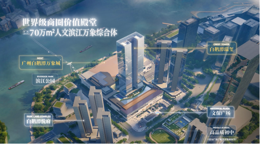 凭借在城市运营方面的多年积淀及对大湾区,尤其是广州城市发展的深刻洞察,华润置地敏锐捕捉这一空间价值,摒弃传统“单点开发”模式,以“片区统筹”思维构建完整城市生态圈——白鹅潭华润置地中心:约18.6万平方米广州白鹅潭万象城、约17万平方米高端住宅白鹅潭悦府、约8.4万平方米高端商业大平层白鹅潭瑞玺、约2.2万平方米滨江公园、约2.5万平方米高品质初中及文保建筑修缮、公服设施配建等七大业态,共同组成“商业+居住+文化+教育+生态”的多元业态闭环。这种“产城共融”的布局,不仅将白鹅潭的地理优势转化为实实在在的城市功能,更推动广州从“单核驱动”迈向“双极共生”的新格局。