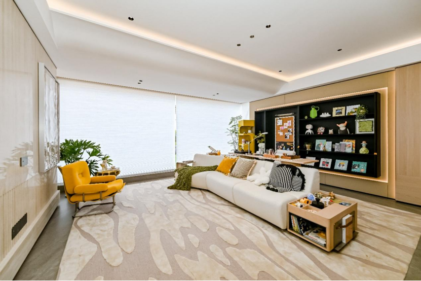 家庭聚场的LDKG一体化:穿过阳光电梯厅入户,便是超尺度的LDKG(客厅-餐厅-厨房-阳台)一体化家庭核心区。周末傍晚,男主人正在厨房准备晚餐,女主人躺在阳台的摇椅上看书,孩子在宽绰的客厅里搭建乐高城堡,抬眼间便能与正在看电视的父母眼神交流。这种无界的空间设计,让家庭成员即便各做各事,视线与情感依然紧密相连。