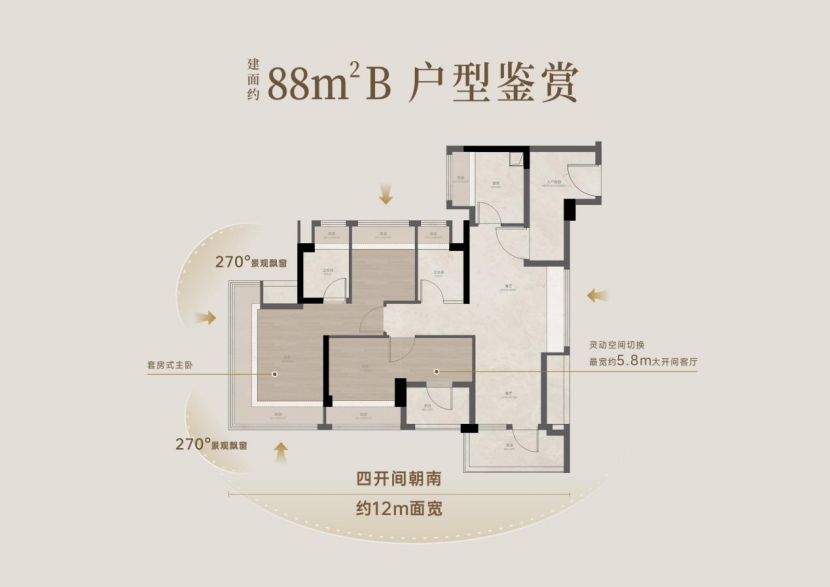 本次已开放样板间的建面约88平方米户型,是白鹅潭首个90平方米内的“真四房”,突破同面积段空间局限,“四空间”的格局,3/4房根据家庭需求自由变化,约12米南向四开间,实现全屋阳光平权;全屋精细化收纳系统,高效利用每一寸空间;环幕主卧套房搭配独立卫浴与实用L型飘窗,尺度感现场更震撼,真正做到了实用。