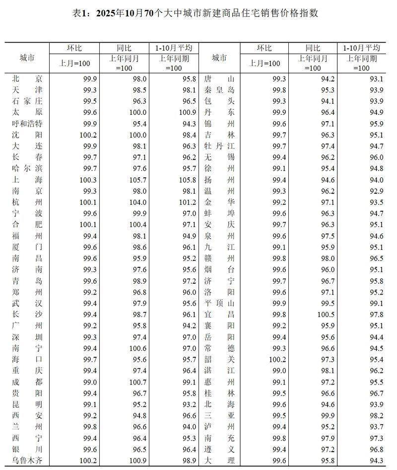 11月14日,国家统计局发布70城房价数据。国家统计局城市司首席统计师王中华解读称:“10月份,70个大中城市中,各线城市商品住宅销售价格环比和同比均下降。”