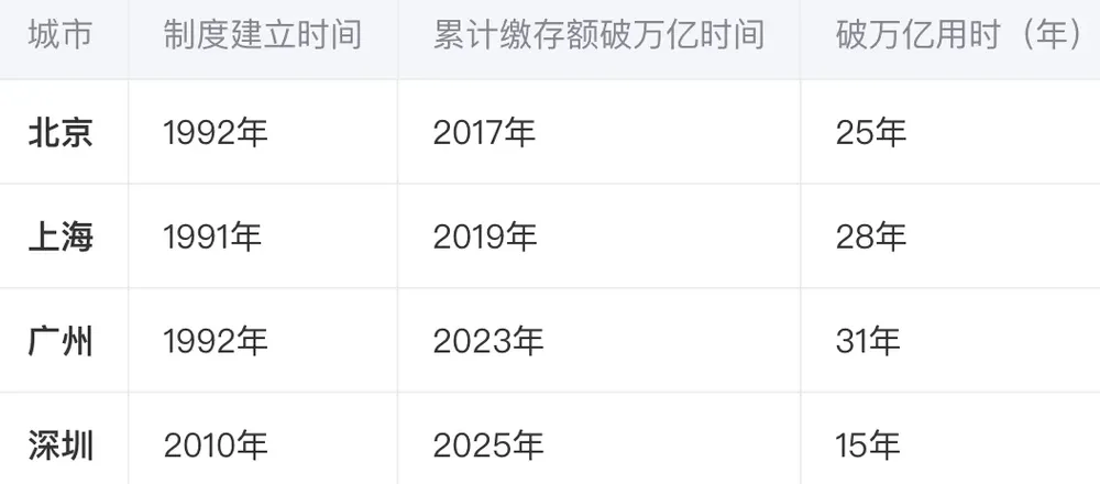 在住房公积金累计缴存总额冲刺万亿元的进程中,广州、上海、北京分别耗时31年、28年与25年。
