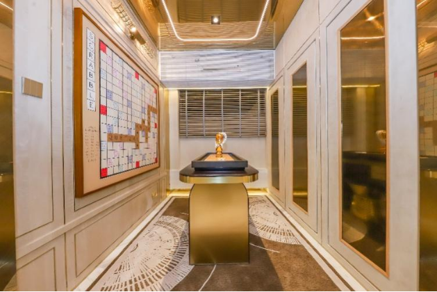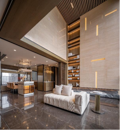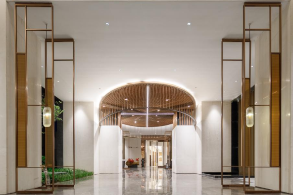 据景观设计师介绍,通过社区大门-园林空间-架空层-入户大堂的多重过渡的设计,可以让业主从踏入社区起就能逐渐放松。来到入户大堂,米黄色沙岩内含天然晶体与贝壳,触感温润且富有自然气息;配合竹节灵感的金属线条,寓意着生活的节节向上。这种对细节的精益求精,让归家过程成为一种心灵享受。